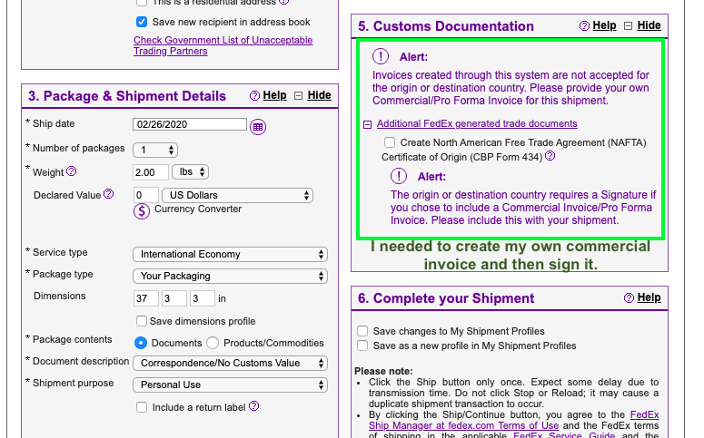 Then you have to find your own commercial invoice from the internet (do not use a FedEx template) and complete it and put three copies in the shipping envelope. FedEx Ship Manager invoices are not acceptable. Invoices must be on company letterhead and be on the outside of the shipment. Here is one that I created.