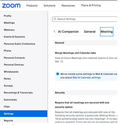 At the top of the Settings page, click on the Meeting tab.