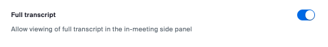Scroll down to Full transcript and toggle this to enabled. This will allow for real-time transcripts/captioning to appear in the expanded right column of the Zoom meeting window (to expand, click the transcript icon from your button bar; similar to the chat button.)