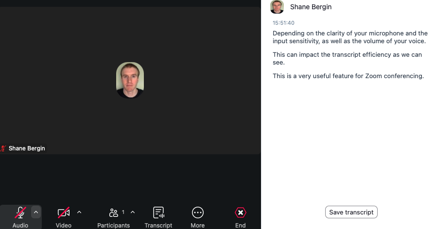 Now as the host you should see the Transcript button in your selection bar, as should your participants.